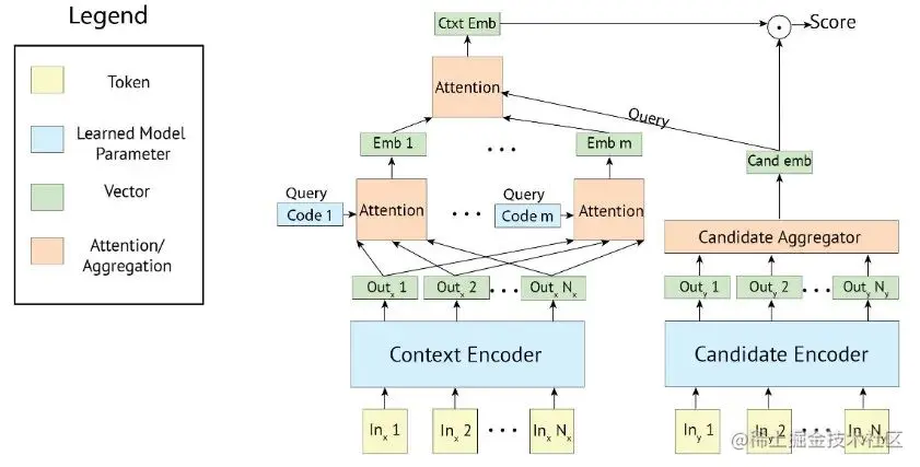 - Poly-encoder首先是通过初始化多个attention模块,对每一个query产生不同的 ,以此获取 query 中一词多义或切词带来的不同语义信息;