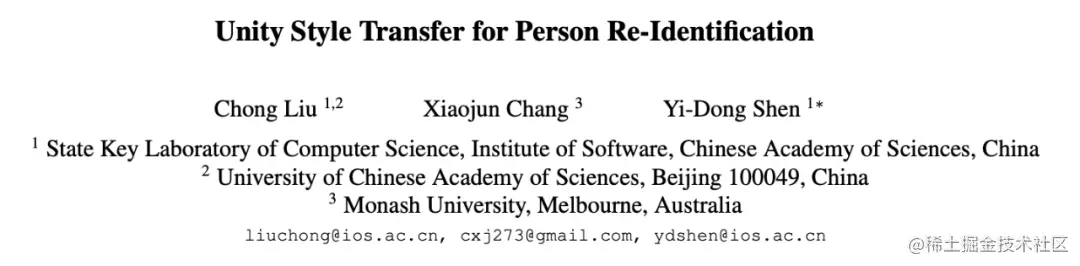 在计算机视觉国际顶会 CVPR 2020 中,中科院发表的论文 《Unity Style Transfer for Person Re-Identification》(《行人重识别的一致风格转移》) 中,提出了一种 UnityStyle 自适应方法,该方法可以统一不同摄像机之间的风格差异。