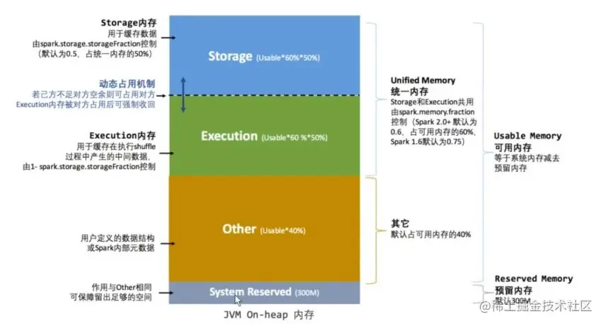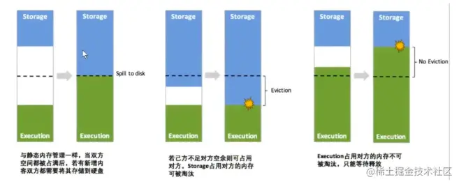 统一内存管理与静态内存管理大致是一样的,只是在静态内存管理的基础上,加入了“动态占用机制”。对于运行期间,存储内存和执行内存不够的情况下,可以临时占用对方的内存,这就使得内存使用的灵活度大大提高,内存使用率也大大提高。