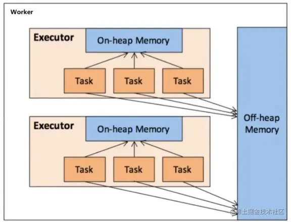 上图展示了一个 worker 节点上的任务与内存的关系。可以看到一个 worker 节点有两个 Executor,每个 Executor 都是一个进程,每个 task 是一个线程。Executor 的内部会有一块堆内内存,也就是主内存,这块内存是每个 task 共享的;两个 Executor 进程之外还有一块堆外内存,是供两个进程共享的。那么,堆外内存是什么时候使用呢?