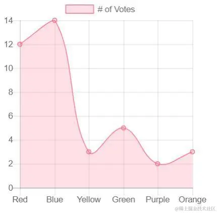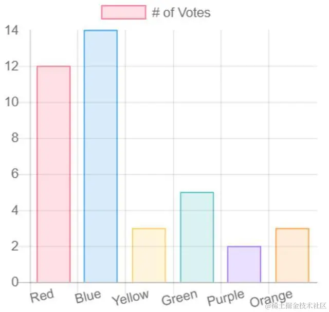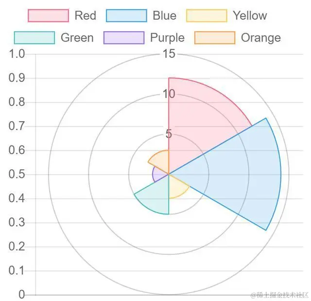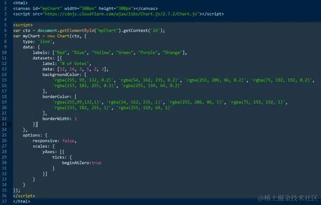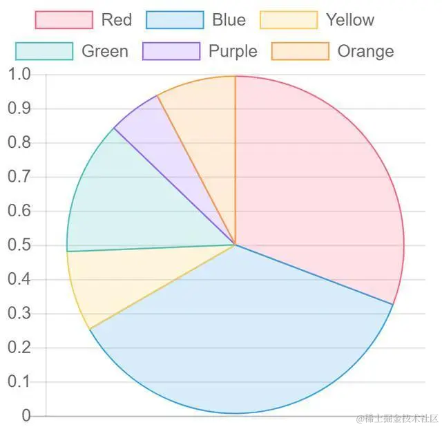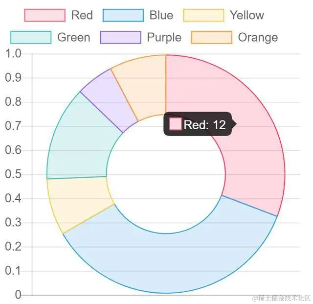 - 第十行:labels: [“Red”, “Blue”, “Yellow”, “Green”, “Purple”, “Orange”]。定义了统计图表的一个维度。如果是线状图,柱状图这些类型,则labels定义的维度作为统计同的横坐标(也就是X坐标)。