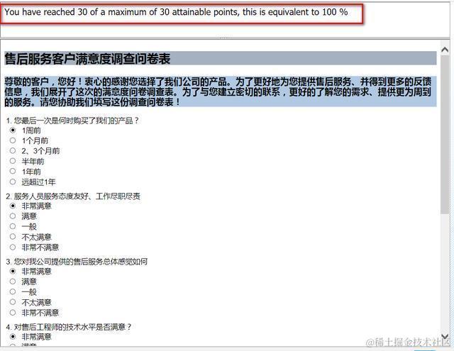测试结果:You have reached 30 of a maximum of 30 attainable points, this is equivalent to 100 %