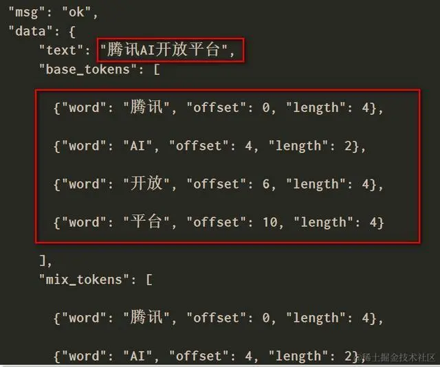即可看到下列输出:“腾讯AI开放平台”这个句子,已经被腾讯人工智能成功分词成了:腾讯,AI,开放,平台。