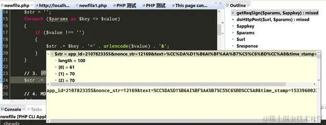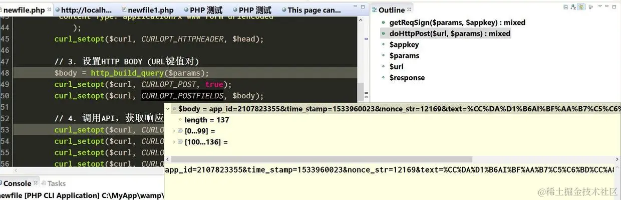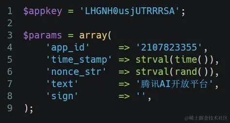 第一行和第四行分别为我在腾讯AI平台上创建的测试应用的key和ID。第五行是发起请求的时间戳,第六行用rand()生成了一个随机数,第七行为希望使用腾讯AI人工智能分词的输入句子,第8行sign是一个需要动态计算出的签名值。