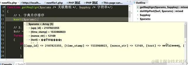 首先执行ksort对PHP的key-value数组$params按照key进行升序排序,可以比较上图升序排序前和下图排序后的顺序: