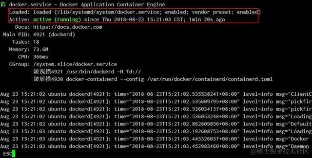 安装完毕后,可以看到Docker服务已经从/lib/systemd/system/docker.service启动了,dockerd进程id为4921: