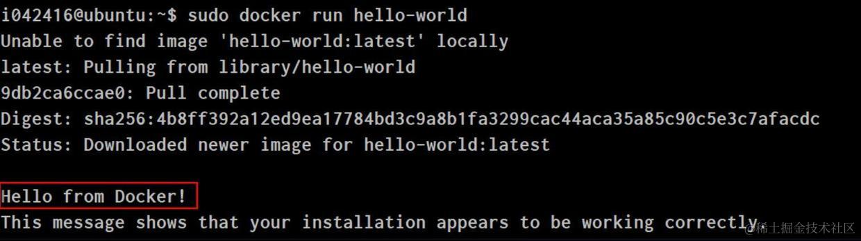 使用命令sudo docker run hello-world,能观察到从远程下载这个测试用的容器:Pulling from library/hello-world: