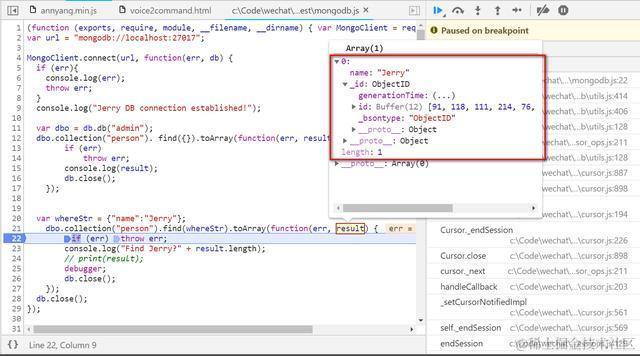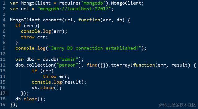 注意第12行的dbo.collection(“person”). find({}).toArray,意思是读取表person里的所有记录。