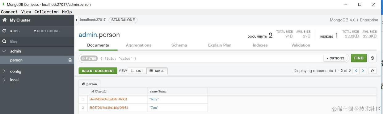 在localhost:27017的服务器上,在数据库admin下面创建了一个名为person的数据库表,并插入了两条记录: