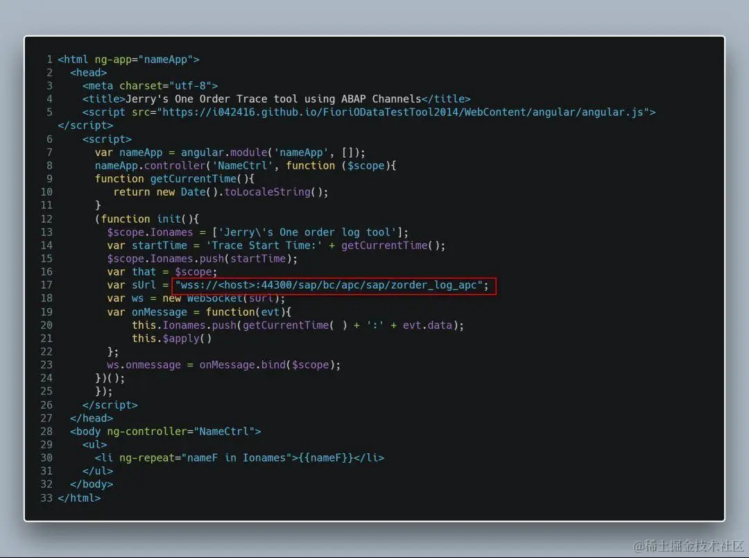 第17行声明了进行前后台通信的Web Socket url: