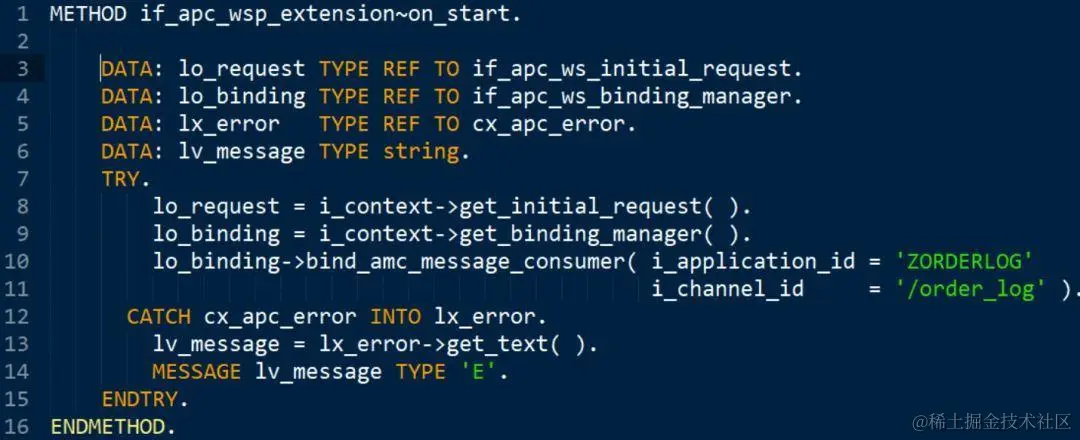 3. 从上图中得知我指定了ABAP类CL_CRM_ORDER_LOGGER用来将应用程序调用One Order API产生的日志发送到Web Socket上去,因此这一步需要对这个类进行编程了。完整代码在我的github上,这里仅阐述要点。