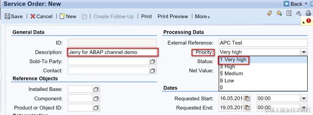 然后直接切换到One Order应用,像往常一样进行操作。比如新建一个服务订单,维护下面几个字段: