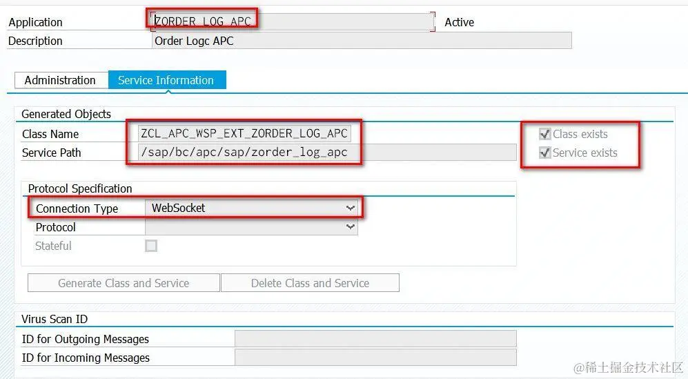 1. 事务码SAPC, 创建一个新的APC(ABAP Push Channel)应用ZORDER_LOG_APC,连接类型要选择成WebSocket。