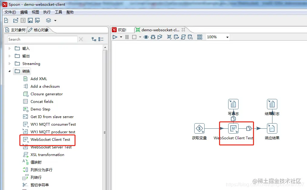 - 通过“WebSocket Client Test”节点来连接websocket服务器,该节点就是通过编写kettle插件实现的。