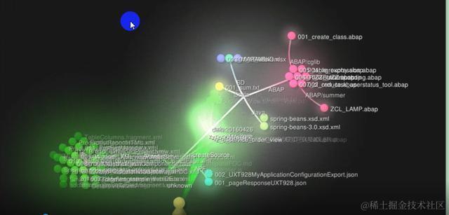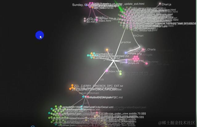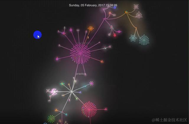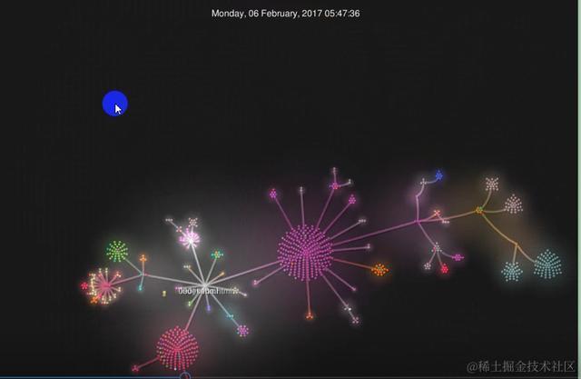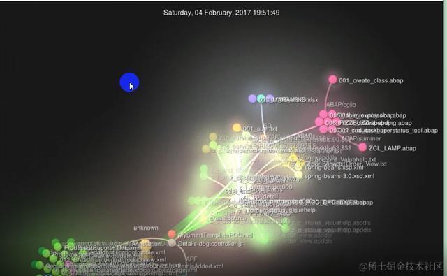 Gource会从指定的github仓库创建那一刻开始(大家看我下面截图的2017年2月4日就是我github仓库的创建时间),以视频的方式显示每次提交的明细。每次提交增加或删除的文件会以不同颜色的小圆圈代表,文件名也能显示出来。