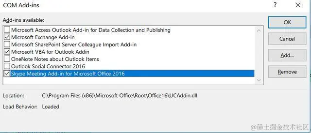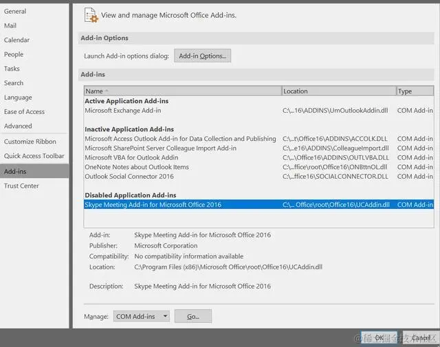 Outlook创建不了Skype会议的解决方案 已注销 2021-04-23 179 阅读1分钟 微软的outlook如果发现忽然不能直接创建新的Skype会议了,那么十有八九是Outlook的Skype插件被禁用了。 Outlook里使用快捷键Alt+F,选择Options: 点击Add-ins标签,果然发现Skype Meeting Add-in for Microsoft Office 2016被disabled了。 点Go按钮: 将这个Add-in重新激活, 即可在Outlook里重新看到创建Skype会议的按钮。 要获取更多Jerry的原创文章,请关注公众号"汪子熙":