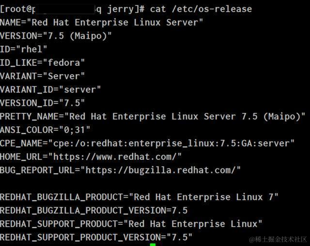 首先用命令行cat /etc/os-release查看当前linux系统的类型,发现为Red Hat: