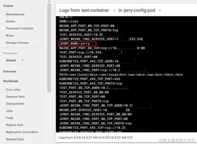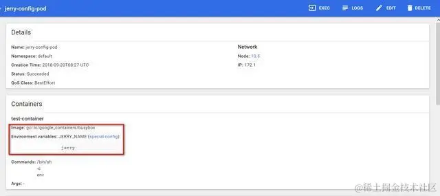因为我yaml文件里指定pod执行的script为/bin/sh -c env, 因此最后会将容器里所有的环境变量都打印出来,我们定义在ConfigMap里的i042416的值jerry也被显示了出来: