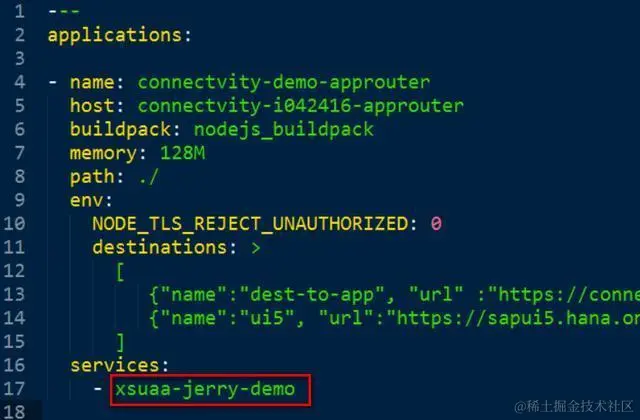 app router在manifest.yml里定义的XSUAA实例名称为xsuaa-jerry-demo,