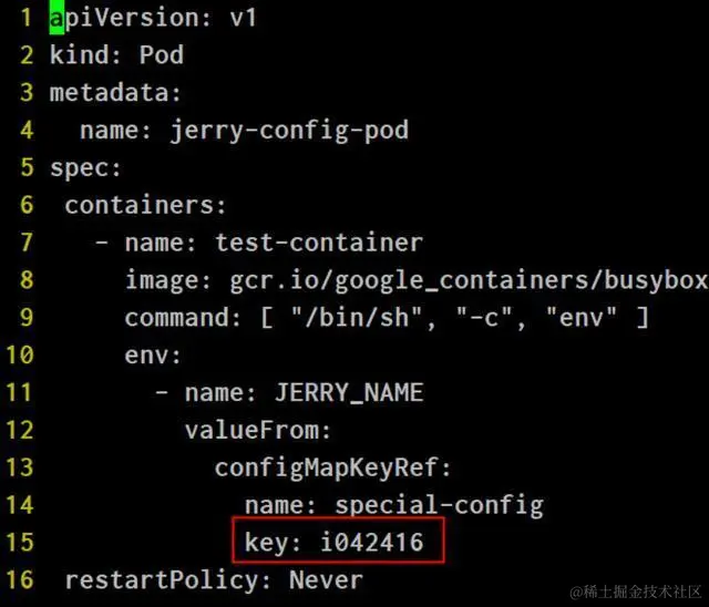 可以看到第15行引用了我的ConfigMap的key:i042416