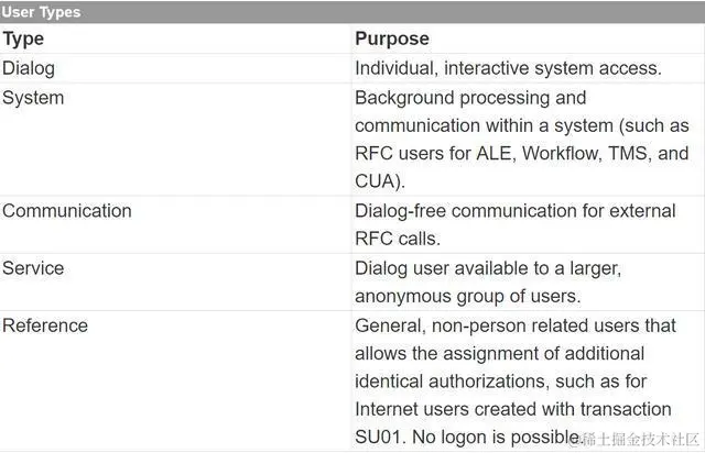 - Reference: General, non-person related users that allows the assignment of additional identical authorizations, such as for Internet users created with transaction SU01. No logon is possible.