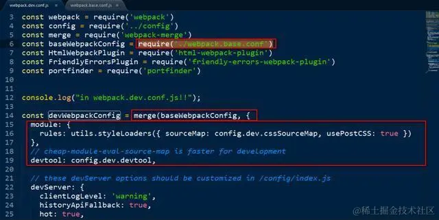 最终dev和prod的webpack配置内容,是webpack.base.conf里的通用内容,加上各自专属文件里定义的配置内容的并集, 参考第14行的merge方法,由webpack-merge模块提供。