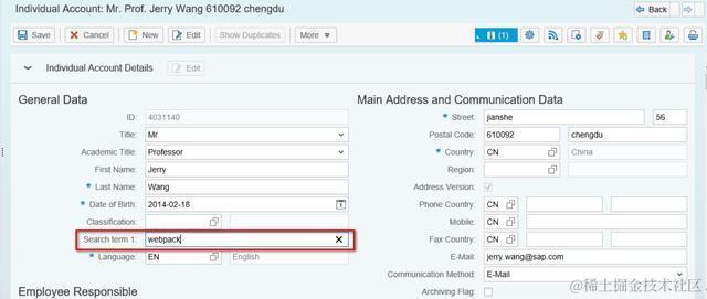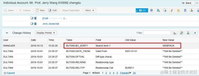 SAP CRM和C4C的客户主数据修改历史记录查询 已注销 2021-04-23 108 阅读1分钟 SAP CRM 随便修改一个字段,比如给Search Term维护值“webpack”: Change History assignment block里显示出了这条修改记录: 根据时间在change history的抬头表CDHDR里找到这条对应的记录: 具体修改明细在表CDPOS里: SAP C4C 如果把客户的某个字段比如地址里的house number从5改成510: 在Feed标签页里能看到修改日志: 要获取更多Jerry的原创文章,请关注公众号"汪子熙":