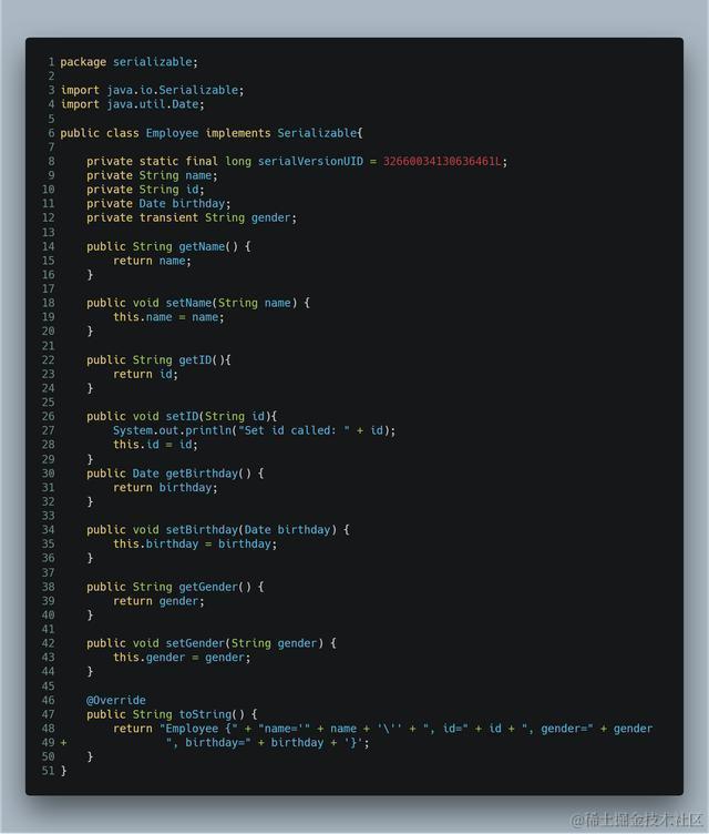 注意第12行代码,gender字段前面的关键字:transient。意思是告诉Java序列化框架,在序列化和反序列化时,不要考虑该gender字段。