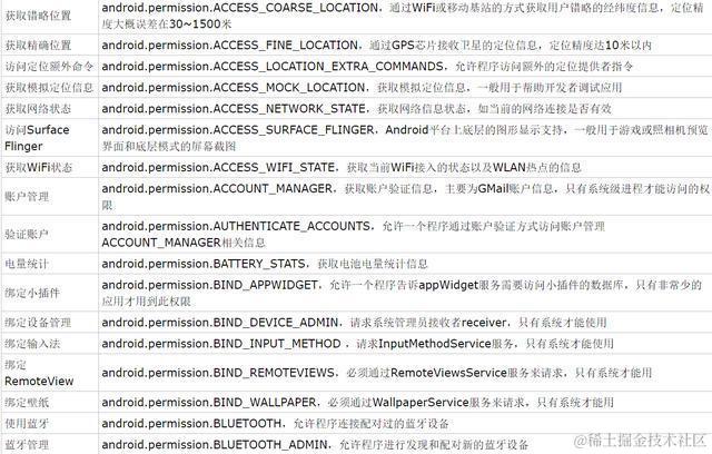 - 描述了应用程序使用某些受保护的程序API或和其它应用程序交互所需的权限。