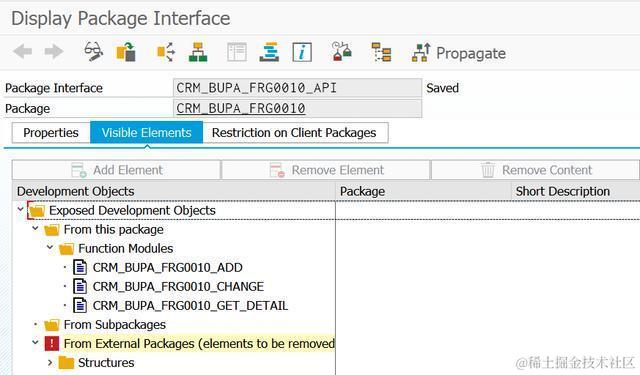 事务码SE21创建ABAP包接口。这是ABAP基于包层面的访问控制实现逻辑。包里可以存储很多ABAP对象。如果开发人员想将某些对象声明为包外程序也能访问,可以将这些对象放在包接口的Visible Elements标签页下面。