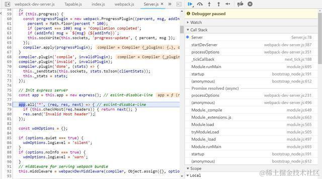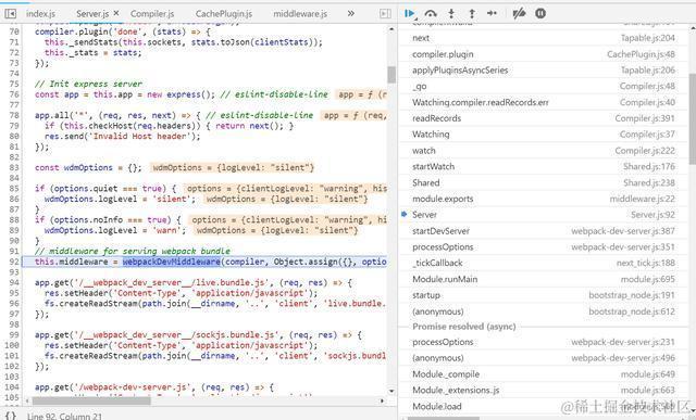 第92行就是Server.js里webpackDevMiddleware的初始化过程。