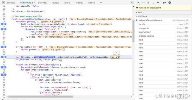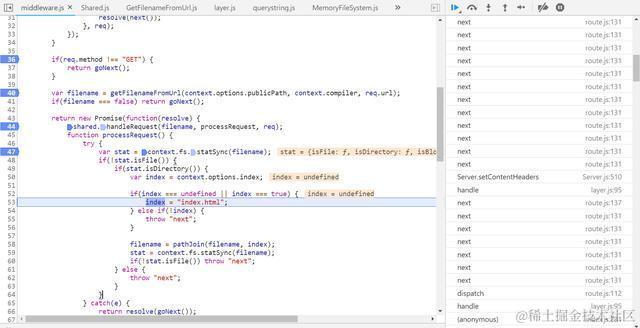 根据前面的描述,浏览器发起前往localhost:8080的请求被webpackDevMiddleware服务,见下图调试截图,其中变量req.url为/,这是我们期望看到的,因为localhost:8080后面没有跟任何路径。