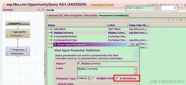 这些必填参数同样是在HANA Studio里建模的,比如UI上看到的参数 Display Currency,对应HANA Studio里的参数P_DisplayCurrency: