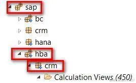 本文例子提到的HANA live query可以从下面的路径找到:打开HANA Studio的系统视图(System perspective): sap->hba->crm->Calculation Views: