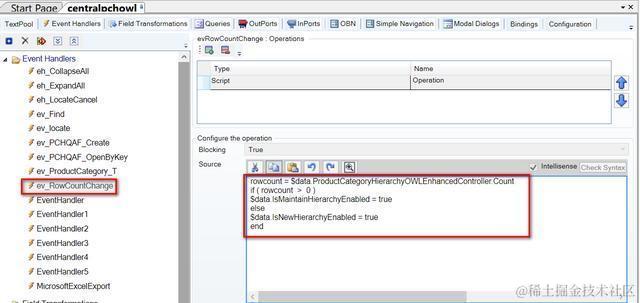 在这个UI模型里有一个事件处理器ev_RowCountChange, 每当表格内记录个数发生变化时会触发。控制newHierarchy按钮是否禁用的模型字段isNewHierarchyEnabled就是在这个事件处理器里进行赋值的。