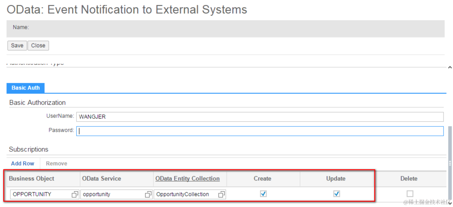 在Subscription标签页,选择Opportunity对应的Business Object和OData服务。因为我只希望CRM监控到C4C Oppportunity的创建和更新,因此我只勾选Create和Update两个checkbox。