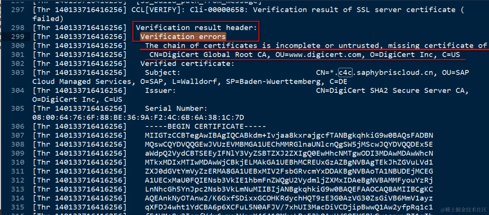 查看日志文件,很快就在里面发现了问题根源,因为Netweaver服务器上缺少c4c.saphybriscloud.cn对应的SSL证书。