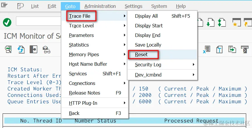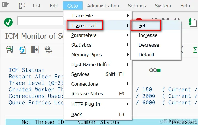 下面是用事务码SMICM找出问题根源。Goto->Trace Level->Set设置跟踪级别: