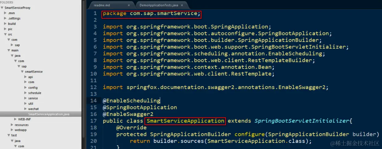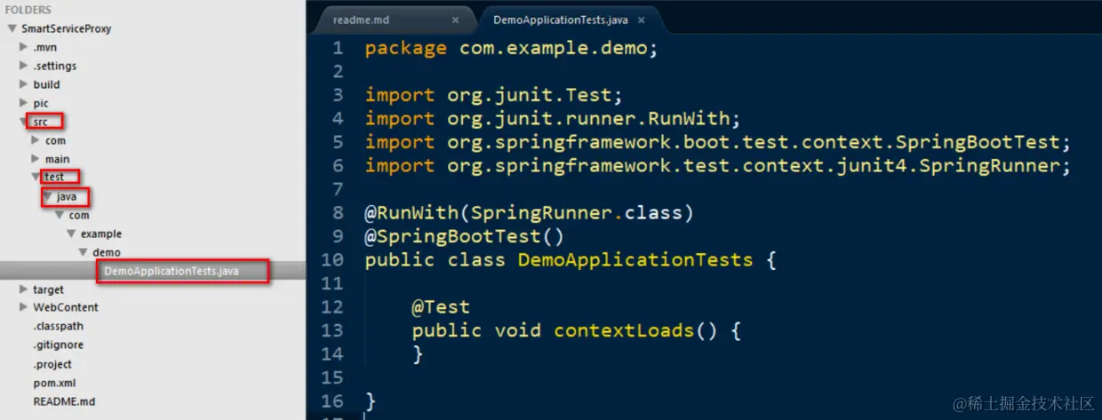 由于我这个SpringBoot项目的入口是com.sap.smartService.SmartServiceApplication, 因此我需要在单元测试启动类里指定这个入口类: