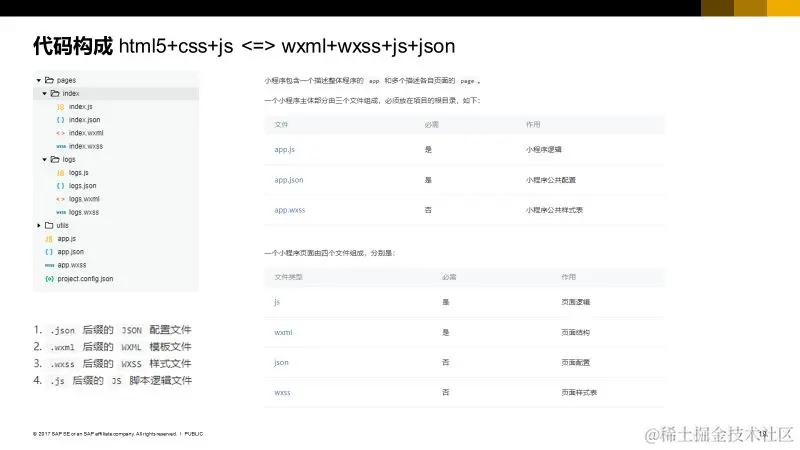基本了解Hello World的功能后,再看文件结构就更容易了。我们先来看看小程序框架中四种类型的文件: