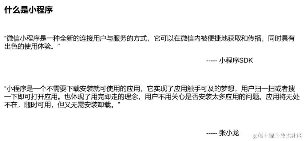 听到这里相信大家对微信小程序的开发已经有了一定了解,我们不妨再回过头来看看小程序的定义。什么是小程序?这是摘自小程序SDK首页上的一句话:
