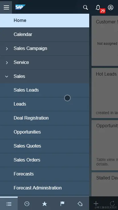 现在大家看到下面这张截图,就是C4C移动端App的界面。虽然是在手机上,但依然可以看出,这是CRM经典的L-shape UI布局。左边导航栏,上方header bar以及右下方大块的工作区域。