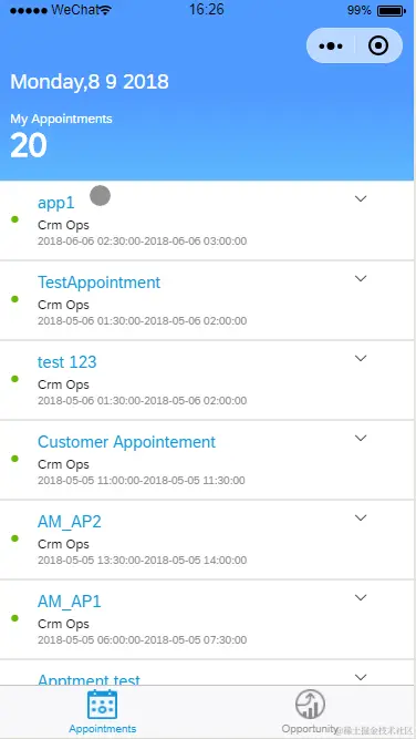打开微信后,通过小程序入口,我们可以迅速启动小程序,登录后就是appointments和opportunity的列表。从上图我们可看到,在小程序底端有两个标签页可以实现两个服务的切换。