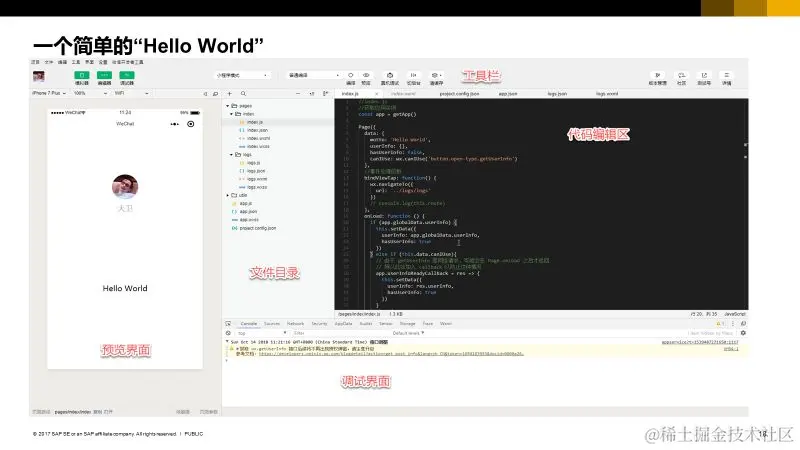 我们再来通过具体的代码片段来理解小程序的开发,上图是Hello World小程序的视图层和逻辑层。从UX的角度来说,如果用户没有登录,会显示一个获取头像昵称的按钮;如果登录过,就显示微信的头像和昵称。我们可以看到,视图层里已经不是我们原来写传统HTML时用到的div,p,span等HTML原生标签,而是经过微信小程序封装的view,button,text等标签,另外还夹杂着一些ifelse判断和花括号的绑定。