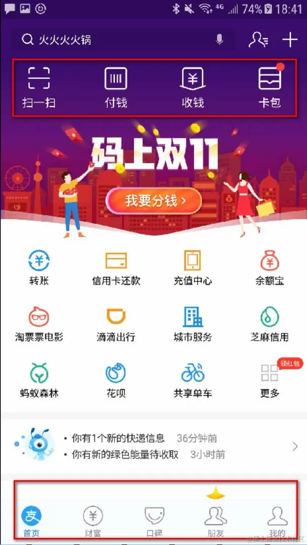 从页面布局上来讲,这个微信小程序的页面布局和微信与支付宝的布局(如下图所示)类似,都是顶部导航栏, 中间工作区,底部标签区域用于切换不同的页面或应用。大部分国内用户比较偏向,或者说习惯这种页面布局。