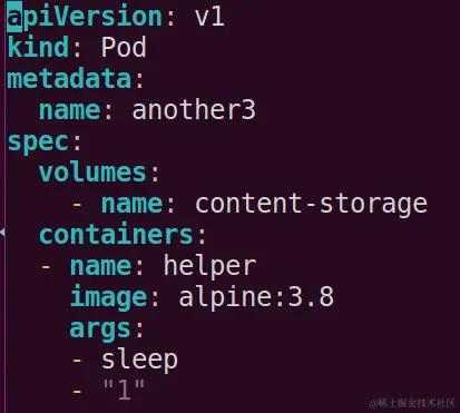 使用命令kubectl describe pod nginx-storage-pod > nginx-storage-pod.yaml, 将describe命令的输出重定向到一个yaml文件里。用vi打开这个yaml文件:
