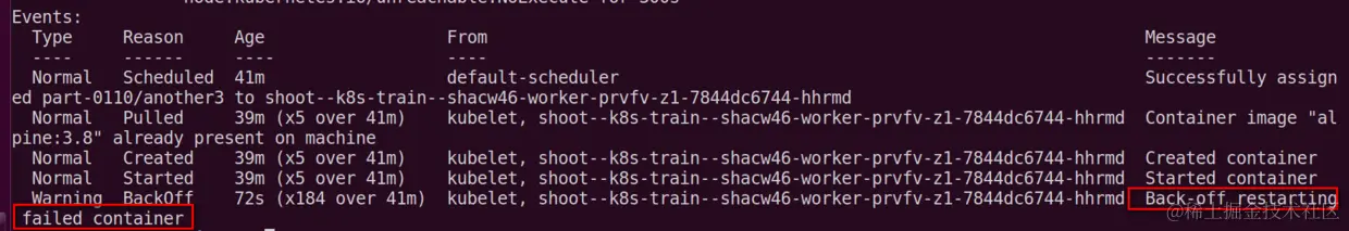 使用kubectl describe pod another3就可以看到这个容器启动的明细:Back-off restarting failed container