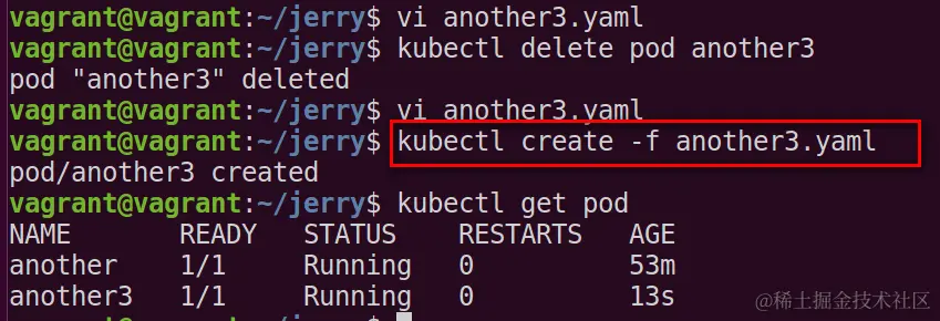 重新创建名为another3的pod,很快就创建成功并且状态处于running了: