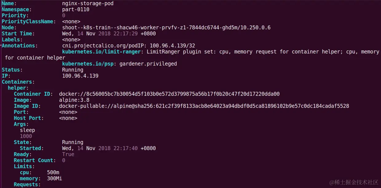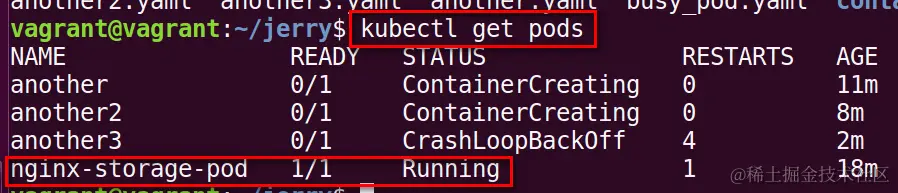 我们可以首先使用kubectl get pods命令得到pod列表,比如我们想研究pod nginx-storage-pod的明细: