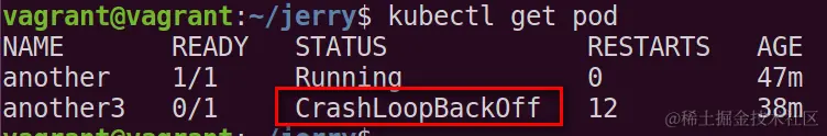 比如我有一个pod名为another3,状态一直处于CrashLoopBackOff, RESTART次数为12: